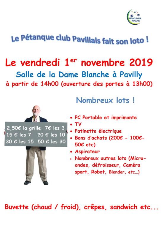 Comme tous les ans, le Pétanque Club Pavillais organisera son grand loto vendredi 1er novembre à la salle de la Dame Blanche, allée de la Cogétéma à PAVILLY.